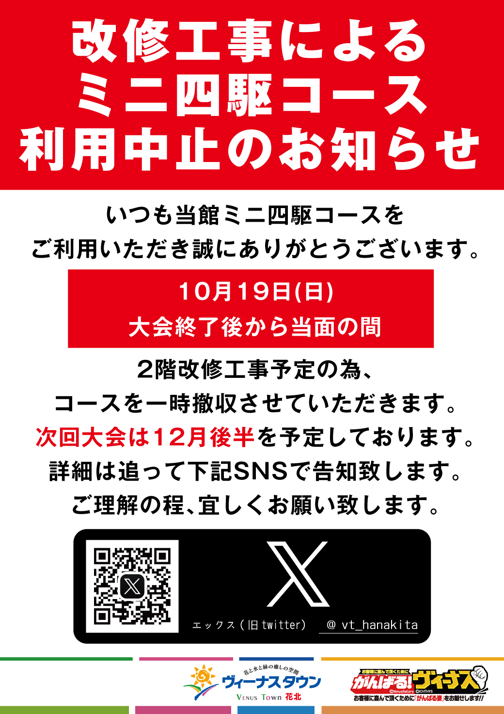10月19日(日)ミニ四駆大会終了後より当面の間、当館2階改修工事の為、コースを一時撤収し利用を中止させていただきます。