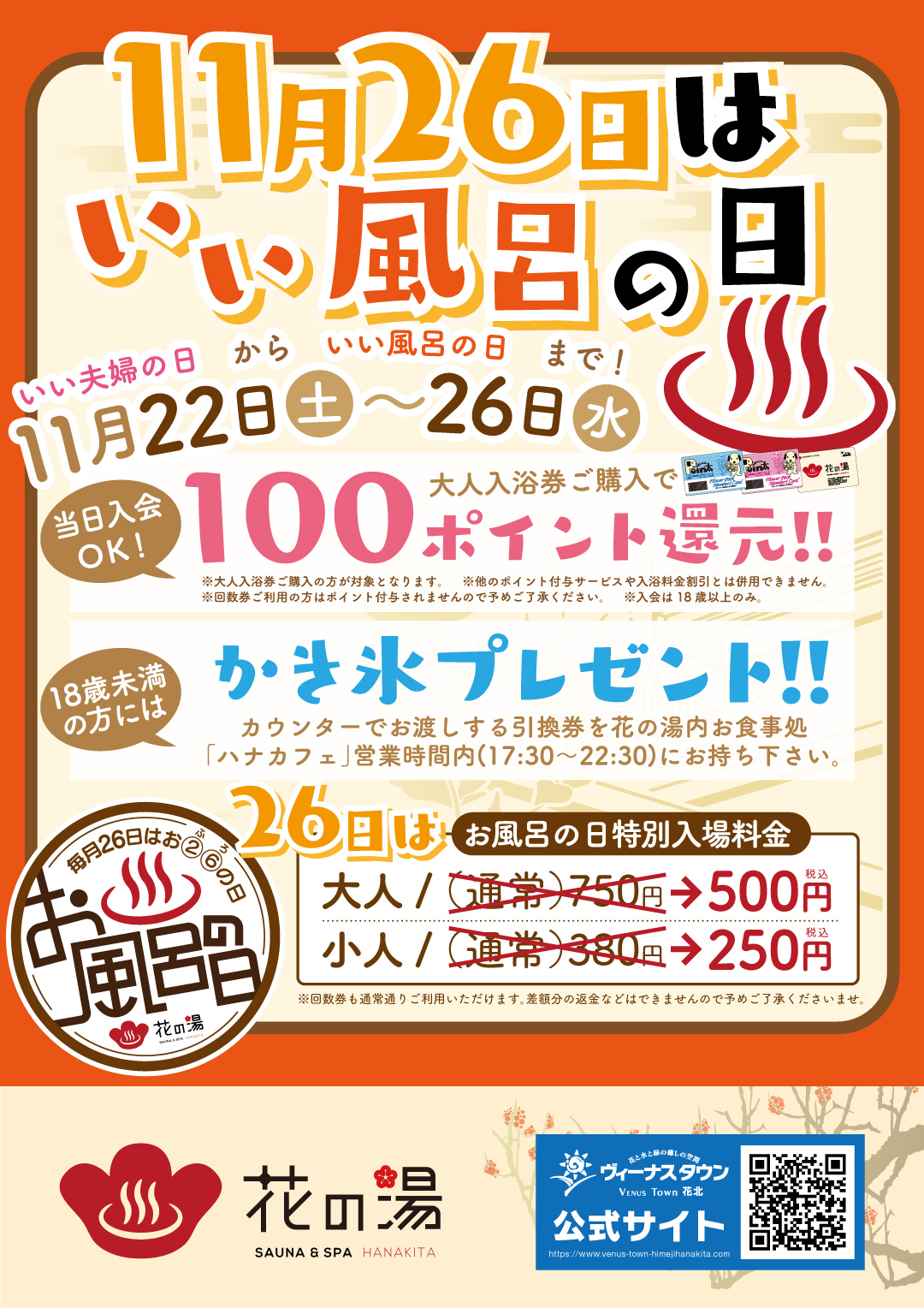 11月22日(土)~11月26日(水)は【花の湯いい風呂の日イベント】開催!